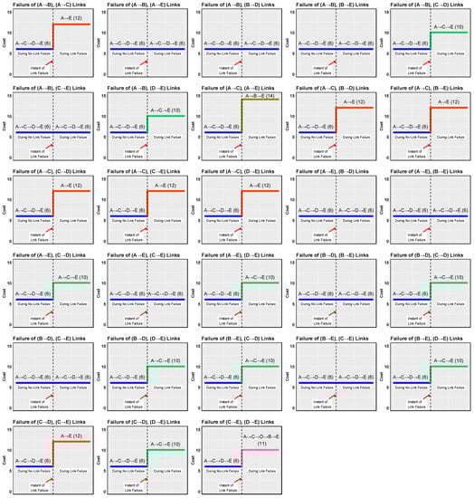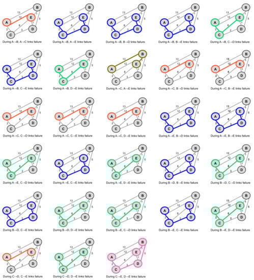Figure 3), 28 combinations of pairs of links can be generated using Equation (4). The resultant network graphs for A to E communication in the proposed topology, subjected to different two-link failures, are shown in