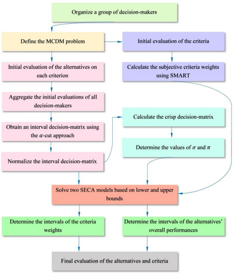 In this section, a new MCDM approach is proposed based on the SECA method, fuzzy numbers, α-cut intervals and SMART. The aim of the proposed approach is to evaluate alternatives and criteria of an MCDM problem simultaneously. The original SECA method is based on a deterministic multi-objective mathematical model and yields crisp values for objective criteria weights and alternatives’ overall performances. On the other hand, the proposed approach can be used in an uncertain environment, and it also incorporates subjective criteria weights, determined based on decision-makers’ opinions and SMART. Moreover, using the α-cut of fuzzy numbers we can obtain some intervals for evaluation and analysis of criteria and alternatives. Here, different levels of α can be used in defining different levels of uncertainty. The framework of the proposed approach is illustrated in Figure 1.