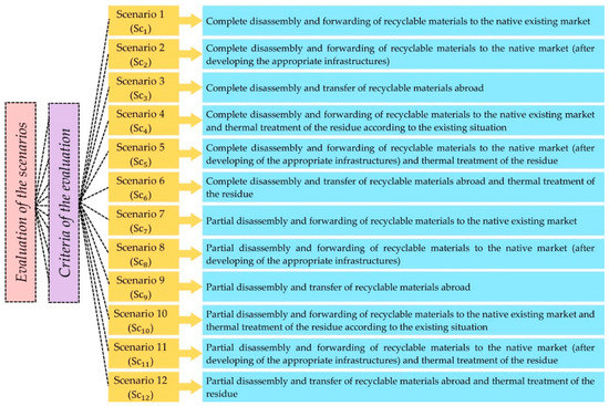Step 2. The group of decision makers reached a consensus on the structure of the problems including the sets of scenarios (alternatives) and criteria according to the literature on this topic. Based on a comprehensive study made by Rousis et al. [54], 17 criteria have been defined to evaluate 12 scenarios for e-waste management. Figure 2 represents the structure of the problem and the list of scenarios, and Figure 3 illustrates the evaluation criteria and their descriptions.