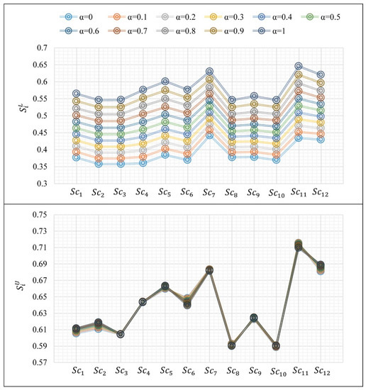 The graphical representations of Table 10 and Table 11 are illustrated in Figure 4 and Figure 5, respectively. It can be seen that the values of the lower and upper bounds are changed reasonably, and we can verify the stability of the final evaluation of the criteria and alternatives in different levels of uncertainty. According to Figure 5, the variations of the lower bounds of the alternatives’ overall performances is greater than the variations in upper bounds; however, the rank of them are stable. To validate the final ranking of the scenarios, a comparative analysis is performed based on the crisp decision-matrix (Table 8) and subjective criteria weights (Table 3). Five MCDM methods including SAW (Simple Additive Weighting), WASPAS (Weighted Aggregated Sum Product Assessment), COPRAS (COmplex PRoportional ASsessment), TOPSIS and EDAS (Evaluation based on Distance from Average Solution) are used for making this comparative analysis. We have chosen these methods since they have been used in several problems and different fields of studies. There are also other MCDM methods that can be used for comparison such as VIKOR, CoCoSo [55] and MARCOS (Measurement of Alternatives and Ranking according to COmpromise Solution) [56]. The ranking results of these methods are presented in Table 12. The Spearman’s rank correlation coefficient () between the ranking results of the proposed method and those of the other MCDM methods are calculated and shown in the last row of this table. Since the values of are greater than 0.8, we can conclude a strong relationship between the ranking results. Therefore, the comparison confirms the validity of the results of the proposed approach.