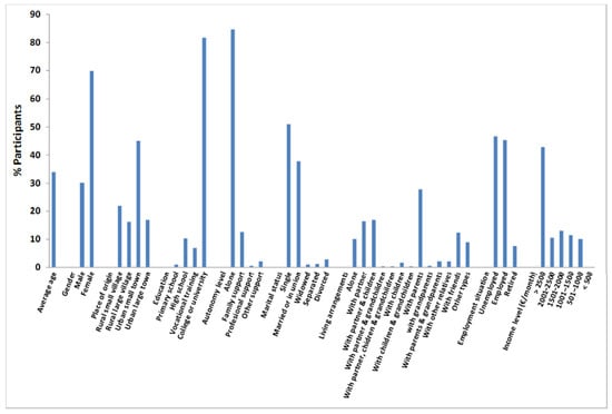 Regarding the place of origin, it is quite distributed, although more than 60% are from urban areas. In education, 81.7% have university studies. Further, 84.7% of the participants are completely autonomous, and 50.95% are single. In relation to living arrangements, 27.9% live with their parents, with a wide variety of situations. Regarding the employment situation of the participants, 46.6% are unemployed and 45.4% have a job. Finally, the level of monthly income is relatively high, with 42.8% of the participants at over EUR 2500 (Figure 1).