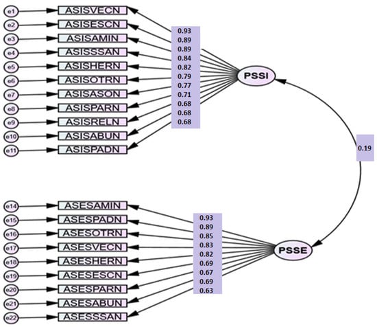 Illustration of the measurement model based on the CFA for the PSS perceived social support scale, with two latent variables or factors, one for instrumental support (PSSI), and one for emotional support (PSSE).