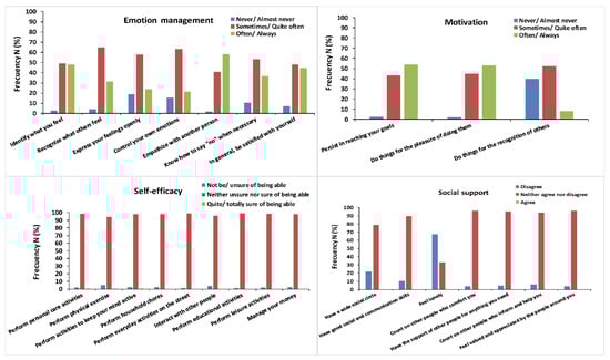 Frequency reported by participants about their emotion management, motivation, self-efficacy, and social support.
