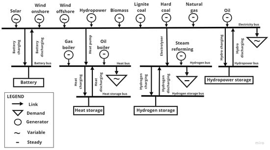 The model did not account for electric-vehicle-driven transportation demand, and only residential demand for water and space heating was considered when assessing the heating sector. Moreover, the model did not consider all hydrogen demand, and additionally, importing or exporting hydrogen was not considered. Energy storage, represented by batteries, hydro pumps, heat storage and hydrogen, increased the flexibility of the system. However, only those technologies that have reached market maturity or will have a significant impact by 2030 were considered in this study. The Section 2 provides a detailed review of the considered technologies.