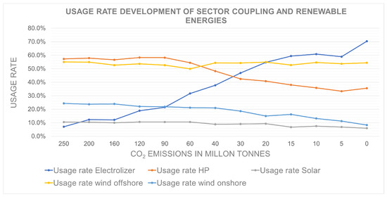 The usage rate of different technologies in the considered sector-coupled energy system with different emission levels.