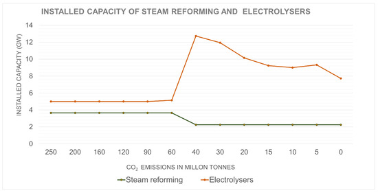 Development of the installed capacity of hydrogen production technologies considered in the model with different emission levels.