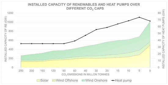 Development of the installed capacities of solar, onshore wind, offshore wind and heat pumps with different emission levels.