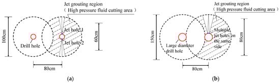 Drill hole layout and jetting mode. (a) Conventional high-pressure jet method; (b) Large aperture high-pressure jet method.