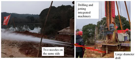 The main difference between the construction procedure of the large-diameter, ipsilateral, multi-nozzle jet grouting cut-off wall and the conventional high-pressure jet grouting cut-off wall is that, firstly, the conventional method usually requires the use of drilling equipment to drill the guide hole in advance, and then jet the slurry through the grouting trolley. However, the construction of the large-diameter, ipsilateral, multi-nozzle, high-pressure jet grouting cut-off wall proposed in this study adopts an integrated drilling and spraying equipment (the nozzle and high-pressure pipeline are embedded into the large-diameter drill). The same equipment can be used for drilling and jet grouting. There is no need to drill pilot holes in advance. The diameter and efficiency of drilling are far greater than those of conventional methods. Secondly, because the nozzle is more concentrated, it can be controlled in the construction of the fixed-jet method, and the nozzle can be controlled to jet in the direction of forward drilling, so that the shotcrete pressure acts on the loosened stratum, which is conducive to the crushing and mixing of rock and soil mass.