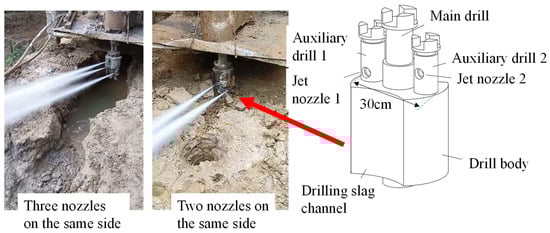 Therefore, through equipment transformation and development, the integrated larger-diameter drill bit and jet design is used for high-pressure jet grouting cut-off wall construction, as shown in Figure 2. Moreover, the high-pressure jet nozzle is set to only jet in one direction, and two or more nozzles are arranged on one side, which can form a more powerful cluster jet than a single nozzle, which is conducive to the fragmentation and deformation of soil when it is cut, and is also conducive to improving the cutting efficiency of high-pressure fluid; in addition, the wall thickness can be controlled by the horizontal spacing and orientation between nozzles. The drilling equipment of ipsilateral, multi-nozzle, high-pressure jet cut-off wall is shown in Figure 3.