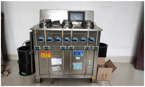 Core samples are drilled and maintained in the cut-off wall until the specified test age. After removing and drying the surface, a layer of sealing material (e.g., silicone rubber) is applied to the side of the sample and the inner surface of the test model. The core sample is pressed into the test model to make both bottom surfaces level. After 24 h of rest, it is loaded into an SS-2.5 permeameter to conduct a water permeability test, as shown in Figure 4. The water pressure increases until all the top surfaces of the specimens are watertight. Water pressure and corresponding constant pressure time t for each pressure section of each sample are recorded.