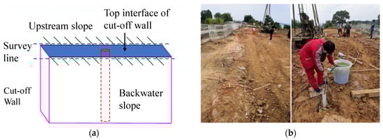 In terms of the detection and evaluation of the cut-off wall quality in hydraulic engineering, as an underground concealed structure, it has always been a difficult problem to detect and evaluate the wall quality of high-pressure jet grouting cut-off wall [,]. However, the quality of the wall plays an important role in the seepage safety and stability of the reinforced dyke [,,]. A borehole coring permeability coefficient test is still the most commonly used testing method to determine permeability [,]. However, excavation and core drilling cause man-made damage to the wall, and increasingly less non-destructive testing methods are also used in the detection of wall quality [,,,]. Modoni et al. [] analyzed the quality of jet grouting with single-fluid and double-fluid jet grouting, and different grouting components and injection parameters through the indoor test of sample coring. Nikbakhtan et al. [] presented the amount of principle jet grouting parameters at the foundation of a dam according to the results of a jet grouting test. Fu et al. [] introduced a new type of on-site non-destructive testing instrument for the impermeability measurement of walls. Zhang et al. [] studied the feasibility of non-destructive testing of polymer cut-off walls based on vibration theory. In addition, the finite element numerical calculation method is often used to explore and evaluate the relationship between shotcrete materials, shotcrete parameters and wall indicators [,,]. Wang et al. [] analyzed the watertightness of jet-grouted cut-off walls with geometric imperfections and deduced a simplified theoretical model. Flanagan et al. [] calculated the in-situ hydraulic conductivities of both the surrounding glacial soils and the jet grout walls by matching observed inflows and piezometric levels. At present, the most reliable methods for the quality inspection of cut-off walls are still excavation detection and borehole coring, while non-destructive detection is an effective supplement.