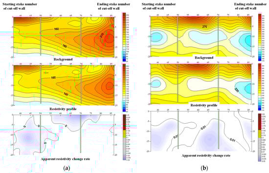 During the field test, the parallel high-density electrical method detection technology is used to collect the background value before water injection on one side of the cut-off wall, then holes are drilled on the other side of the wall, and salt water is injected into the holes to fully penetrate the wall with the salt water. If there are hidden engineering dangers such as leakage in the cut-off wall, the salt water leaks to the opposite side through the hidden dangers, resulting in the reduction of the resistivity value of the corresponding position. At this time, a group or multiple groups of resistivity profile data at different time periods are collected, the resistivity profile after water injection is compared with the background resistivity profile, and the change amplitude of the resistivity value is amplified by ratio processing. The calculation formula of ratio processing is shown in Formula (4), and the place with a large ratio change is determined as the location of hidden leakage danger. The site layout is shown in Figure 5.