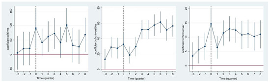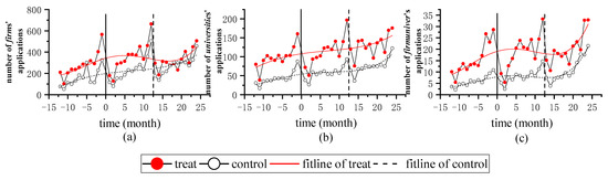 Figure 1 shows the time trend of the output of green invention patent applications for all provinces in the treatment and control groups. The trend in Figure 1 can provide information as to whether there is a difference in green inventions before and after the event point. The ordinates of Figure 1a–c represent the output of green invention patent applications for firms, universities, and firm–university collaborations, respectively. Therefore, the trend difference before and after the pandemic between the treatment and control groups can be visually displayed. From the dotted-line graph, it can be seen that the parallel trends in all three sub-figures are changed significantly after the event point (t = 0). From the trend-fitting line of Figure 1, the parallel trend of the two fitted lines is more obvious before the event point than after that. After the event point, the change of parallel trend in Figure 1a is more significant than the other two sub-figures. However, it can be seen that the parallel trend in all sub-figures changed significantly about 12 months after the event point. Overall, after the outbreak of the COVID-19 pandemic, the difference in green-invention-patent output between the treatment group and the control group shows a trend from increasing to decreasing. Compared with the university, the change of this difference is more obvious in the green invention patent application of firms and firm–university collaborations. Therefore it meaningful to further analyze the impact of the pandemic on green inventions and the difference of this impact on firms, universities, and firm–university collaborations.