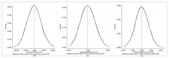 The promotion effect of the COVID-19 pandemic on green invention patents may be interfered with by other non-observed omitted variables. A placebo test is conducted to exclude this interference. The specific idea is to make the impact of the core independent variables on the dependent variables random and then repeat this process 500 times. Figure 3 shows the probability density distribution of the estimated coefficients. The dependent variables of the corresponding models in Figure 3a–c are the green invention patent output of firms, universities, and firm–university collaborations. The mean values of the randomly processed estimates in the three sub-graphs of Figure 3 are −0.320, −0.077, and −0.006, respectively. These values are very close to 0, and the mean p-values are insignificant. The estimated results of the baseline regression model in Table 2 are far outside the entire distribution. Therefore, the hypothesis that there is interference from other non-observed missing variables should be rejected. This result shows that the promotion of the COVID-19 pandemic on green technology innovation is real.