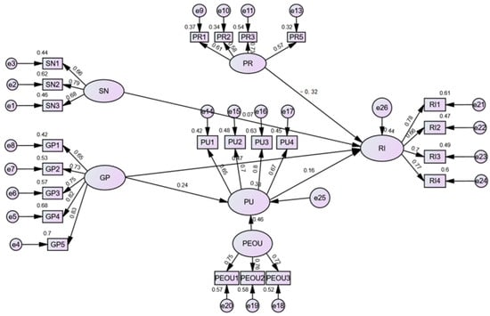 Among the external variables, subjective norms have no significant effect on tourists’ reservation intentions (β = 0.07, p = 0.355). Government policy has a significantly positive effect on both perceived usefulness (β = 0.24, p = 0.003) and tourists’ reservation intentions (β = 0.47, p < 0.001). Thus, H4 was not supported, and H5~H6 were supported.
