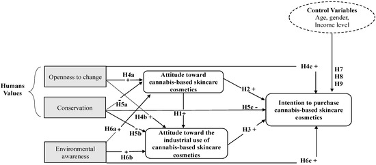 Furthermore, this article considers the theoretical contributions of individual personal values. Values are criteria or goals that use principles in life as guiding parameters [28]. The term “value” is seen as the most important element of an individual’s belief system [29]. Factors based on personal values act as important influencers in the formation of an individual’s attitude toward satisfaction [30,31]. As such, this study considers the contributions of individual personal values by Schwartz [32], by exploring the role of the values of conservation and openness to change to explain the attitude and purchase intention regarding cannabis-based skincare cosmetics, as seen below.