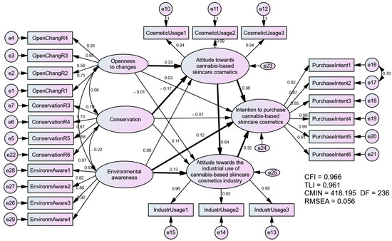 In addition to the reliability reported in the previous paragraph, all factors in the model comprised three or more indicators with satisfactory statistical significance (p < 0.00). Although 3 (out of 20) variables presented standardized factor loadings ranging from 0.5 to 0.7, they were kept in the model by taking into consideration that models comprising many variables and latent indicators can have some variables with loadings of 0.50 or higher, and are still expected to lead to satisfactory model adjustments [55]. As for the measurement model, the structural model used to test the research hypotheses was also estimated by the IBM-AMOS-24 package. All the variables were retained in the measurement model, except for two variables that were removed. Two purchase intention indicators (I “intend” and I “want” to buy cannabis-based skincare cosmetics at the next opportunity) had their errors correlated based on modification indices. They were kept in the model, since they presented similar meanings and were considered of paramount importance to help better understand the investigated phenomenon.