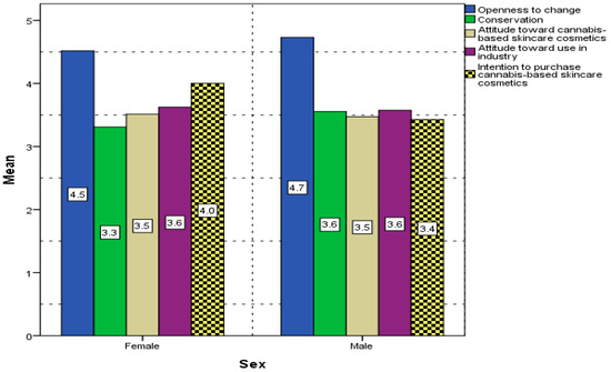 The purchase intention among gender, age, and income ranges, was compared by means, based on the t- (sex) and Z- (age and income groups) tests. The comparison between genders showed that women’s intention to buy cannabis-based skincare cosmetics (mean = 4.0) was significantly higher (p = 0.016) than that of men (mean = 3.4), confirming Hypothesis H8. Figure 3 shows the factors’ means compared across genders, with purchase intention (the only factor with significant differences) hatched to facilitate the comparison.