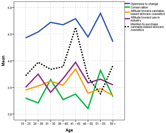 There is a positive association between age and intention to purchase cannabis-based skincare cosmetics.
