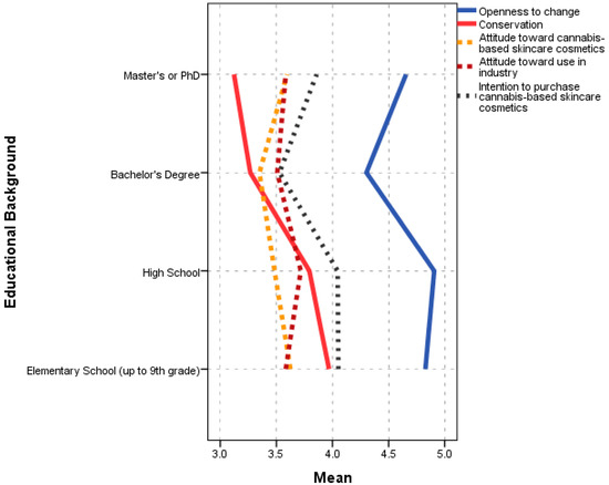 According to the results, the values existing in the model contributed to attitude formation. Although none of the values directly influence the intention to consume/not consume cannabis-based skincare cosmetics, both the openness to change and the conservation attitudes influence the attitude toward cannabis-based skincare cosmetics, the former positively and the latter negatively. The results of the structural model also confirmed that a positive attitude toward cannabis-based skincare cosmetics is a fundamental condition for the acceptance of its use in the cosmetics industry. Meanwhile, environmental awareness favors both the acceptance of cannabis for industrial purposes and the use/consumption of cannabis-based skincare cosmetics.