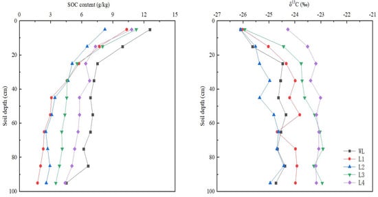 3.1. Vertical Distribution of δ13C and SOC in Soil Profile