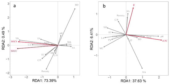 3.4. Relationship between Soil Physicochemical Properties and SOC, SOC Stocks and β, and δ13C Value
