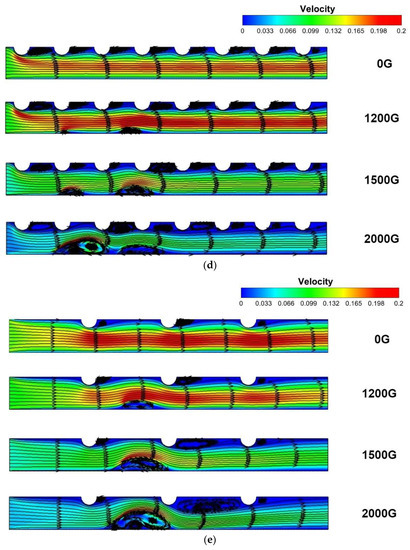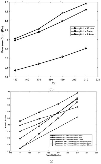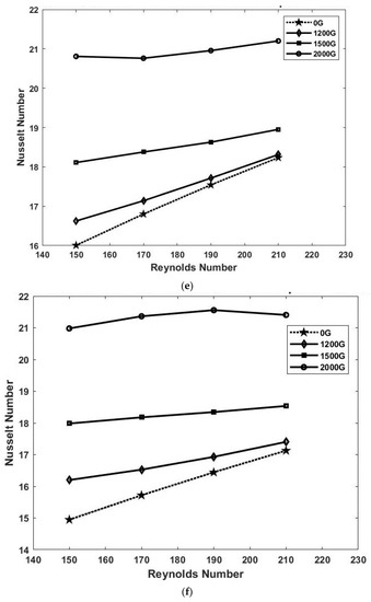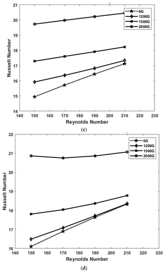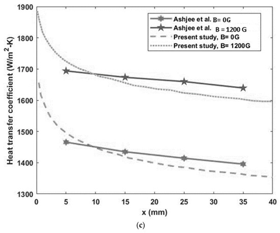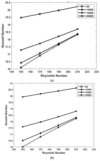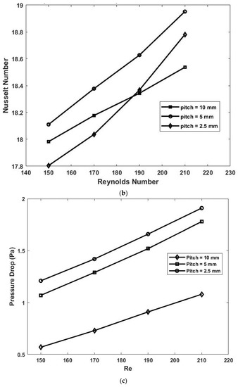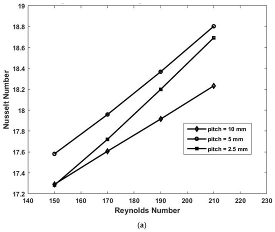 - There is an increase of 3.53%, 10.77%, and 25.39% in the Nusselt numbers when the magnetic fields of 1200 G, 1500 G, and 2000 G, respectively, are applied at x = 15 mm, as compared to the flow without a magnetic field when the pitch = 10 mm;