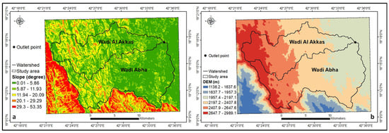 The drainage basins of Abha are located in the southwestern part of the SA, between latitudes 18°09′ N–18°21′ N and longitudes 42°21′ E–42°36′ E. (Figure 1). The study area covers 533.93 km2 and is distinguished as the best tourist attraction. The southern and southwestern sections had the lowest elevation between 1136.2–1637.6 m above sea level (asl), while the central-northwestern sections had the highest elevation between 2408–2989 m asl (Figure 2a). The study area’s elevation ranged from 1136 to 2989 m asl (Figure 2a).
