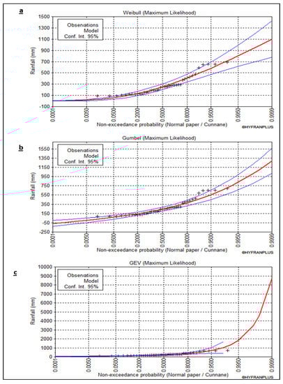 (a–c) Weibull, Gumbel, and GEV graphs of rainfall depths for the model storms.