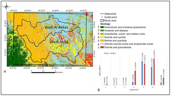 (a) Digitized geologic map of the study area and (b) Geological area distribution in Wadi Al Akkas and Wadi Abha (modified after [76]).