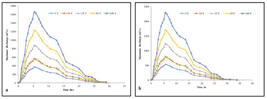 Estimated peaks flow for 5–100-year events of (a) Wadi Al Akkas and (b) Wadi Abha.