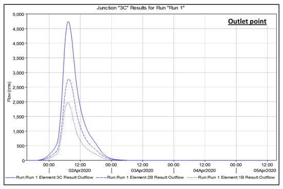 The HEC-HMS calculates the runoff of Wadi Al Akkas and Wadi Abha between April 1 and 5, 2020, when there is the most rainfall (Figure 10). The red colour in Figure 10 represented total water lost by infiltration, while the blue colour represented storm surface runoff, which resulted in peak discharges. Wadi Al Akkas and Wadi Abha have peak discharges of 1979 m3/s and 2776 m3/s, respectively (Table S1). The maximum outflow at the junction (outlet) was 4741.4 m3/s (Table S1). The volume of water discharged from Wadi Al Akkas and Wadi Abha was 445.3 and 457.5 MM, respectively (Table S1). Wadi Al Akkas and Wadi Abha have low soil infiltration and high outflow; the latter sub-basin had higher outflow values than the former (Figure 10). Most urbanization (villages) is concentrated in Wadi Abha (Figure S4), which has low infiltration and high surface runoff. The main geology in the investigated area was hard rocks, mainly granite and syenite, which are concentrated in the Wadi Abha’s eastern part. The latter area has very low permeability, which increases surface runoff in Wadi Abha more than in Wadi Al Akkas. The sink’s total hydrograph (outlet point) represented the total outflow from Wadi Al Akkas and Wadi Abha (Figure 11).
