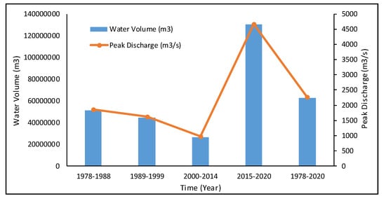 By entering the mean rainfall for each interval, the HEC-HMS model calculated the outflow and water collection volume (Table 5, Figure 12). Water volume decreased from 1978 to 2014 due to a decrease in average precipitation but increased dramatically from 2014 to 2020. (Figure 13). The most recent period generated a large amount of water (130.4 × 106 m3), the soil was primarily hard rocks (low infiltration), and topographical fluctuation and narrow channel widths contributed to high peak discharges. The peak discharges and outlet area of the two sub-basins varied from 387 m3/s to 4677 m3/s (Figure 13), while the time to peak in the two sub-basins went from 960 min to 990 min (Table 5).