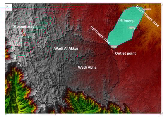 WMS delineates the drainage basins affecting the outlet point, located next to AlMahala village in Abha city (Figure S2). The outlet points collect inflow water and discharge it into Wadi AlMahala, Bani Malek (Aseer), and AlMahala village (Figure 1). Two drainage basins, Wadi Al Akkas and Wadi Abha, with 4th order streams, were extracted (Figure S2a,b). Abha Dam is part of the wadi Abha, a barrier to surface runoff that recharges the alluvium aquifer. It has a capacity of 213 million cubic meters (MCM) and stands 32 m tall. The Ashran dam, which opened in 1985 and controls food probability, is located in Wadi Al Akkas. These dams will provide potable water for two million people by 2030 and water for approximately 15,000 ha [76].