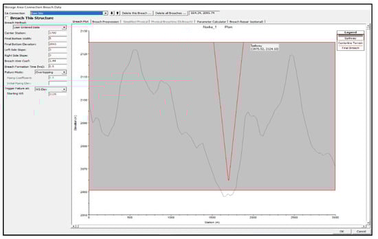 Most of the flooding (130.4 × 106 m3) will be directed towards and around AlMahala village because the outlet point is not directly connected to Wadi Abha. They pose a threat to residents and can cause damage to infrastructure. A dam is built between the upstream storage area (Wadi Al Akkas and Wadi Abha) and the perimeter area (downstream, largely undeveloped) (Figure S8a,b) to slow the flow, force surface water to flow slowly into Wadi Abha, and reduce flooding. The Dam (Figure 15 and Figure S9) was constructed at the outlet point to direct surface water flow into the Wadi Abha channel, away from AlMahala village and its surroundings. The dam stores floodwater and causes surface water delay, allowing for water leakage and a long time for people to evacuate [90]. The HEC-RAS model simulates the proposed dam breach investigation based on the geometrical data (Figure 16).