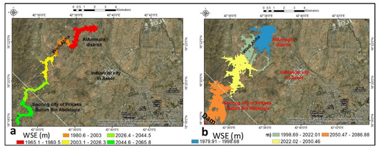 The downstream perimeter area signifies normal depth, while the water surface gradient signifies a friction slope (HEC 2010). The initial condition (unsteady flow simulation) is made up of flow and various elevations of storage areas (DEM) (HEC 2010). There are two options for the flooding distribution rate: no dam installation and installing and designing the dam breach. In two scenarios, the perimeter area and shape of the periphery change (Figure S8 and Figure 15). It is primarily concentrated above Wadi Abha to fill it with surface water and reduce flooding and infrastructure damage. The perimeter’s outlet area also lies on Wadi Abha, allowing the drained water to fill the wadi. Instead of flooding AlMahala village or surrounding areas, the water inflow from the outlet point can be directed towards the wadi Abha. With no dam installed, the water depth is divided into four flooding probabilities: low (0–1.9 m), medium (2–3.8 m), high (3.9–5.5 m), and very high (5.6–11.4 m) (Figure 17a). With dam breach design, flooding depth is classified into four types: low (0–7.9 m), medium (8–16.6 m), high (16.7–26.5 m), and very high (26.6–40.3 m) (Figure 17b). Flooding distribution broadens as a result of dam construction. They are scattered throughout Wadi Abha, far from villages and industrial cities (Figure 17).