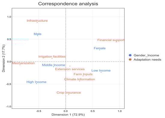 Perceptual map of correspondence analysis showing the relationship between adaptation needs and social status (gender and income). Source: Authors’ survey.