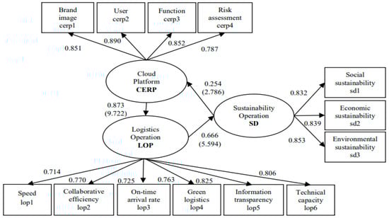 The cloud logistics operation dimensions included “speed”, “collaborative efficiency”, “information transparency”, “green logistics”, “accuracy”, and “technical capability”, which were the main factors affecting the selection of logistics operation. In addition, as shown in Table 8, “information transparency” had the highest estimated load value of 0.825, and its R2 value was 0.680, much higher than 0.4, indicating that it was very explanatory. The estimated load values of the other questions were between 0.714 and 0.825, and the T-value was also greater than 1.96, reaching a significant level. The R2 values ranged from 0.510 to 0.680, and all the questions came to the standard of 0.4, indicating high explanatory ability. According to the above analysis, “speed”, “collaborative efficiency”, “information transparency”, “green logistics”, “accuracy”, and “technical capability” were the main factors affecting logistics operation. Of these, “information transparency” had the strongest correlation with logistics operation, which was consistent with the data feedback of our research. The reason was because an end-to-end cross-profession integrated supply chain collaboration and control platform possesses the transparency of end-to-end supply chain information.