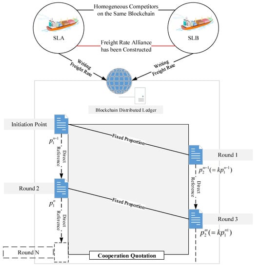 There will be a fixed proportional relationship between freight of SLA and freight of SLB. The joint quotation strategy of the Freight Rate Alliance is illustrated in Figure 1. Two SLs reach an agreement on the quotation strategy in the consensus mechanism. Additionally, the relative freight is introduced to denote the fixed proportional relationship between two SLs. That is, SLA and SLB quote in fixed proportion. In other words, the freights of both SLs are adjusted at the same time and in the same range to maintain the stability of the relative freight. As a result, the lagged terms of the freights become direct reference for both SLs. Additionally, the target under the joint quotation strategy is to find the optimal combination to obtain the maximum profit of the Freight Rate Alliance.