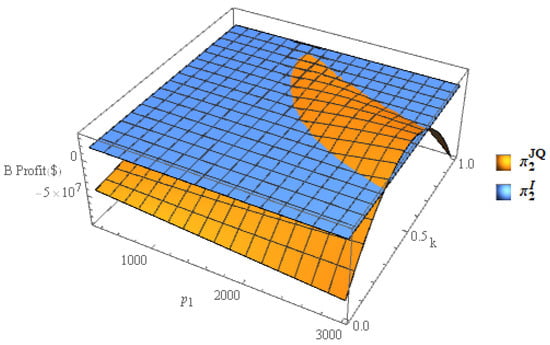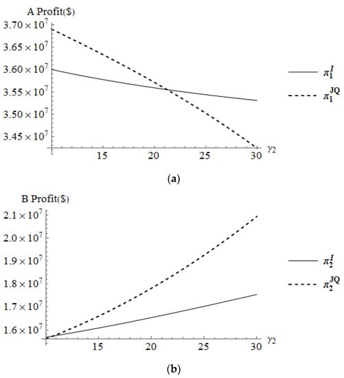 According to Figure 8a, the improvement in the SLA’s service substitution effect is unfavorable for its own profit no matter whether it is under the joint quotation strategy () or in the Initial Theoretical Equilibrium state (). Moreover, SLA’s profit is more sensitive to the change in under the joint quotation strategy than in the Initial Theoretical Equilibrium state. The enhancement of SLA’s service substitution effect is detrimental to its own stable profit under the joint quotation strategy. When reaches a certain level, SLA will not continue to obtain excess profit and even face a worse profit level than the initial state if it continues to adopt the joint quotation strategy.