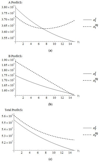 According to Figure 7a,b, both SLA’s and SLB’s profits at the initial state are negatively affected by the improving of SLB’s service substitution effect. While SLA’s profit under the joint quotation strategy () is more stable and is higher than the initial state when is reasonable and appropriately increased, SLA’s profit in the initial state seems to be higher when too small. SLB’s profit under the joint quotation strategy () is more sensitive to the change of . However, the joint quotation strategy will usually ensure that SLB obtains an excess profit better than the Initial Theoretical Equilibrium state when is not too high.