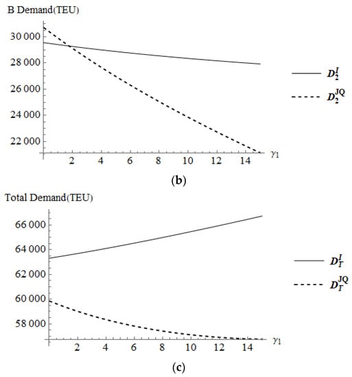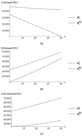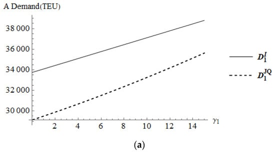 According to Figure 10b, the demands of SLB under the joint quotation () and the Initial Theoretical Equilibrium state () are both positively affected by . The demand level of SLB under the Initial Theoretical Equilibrium state is higher than that under the joint quotation strategy. Additionally, the demand of shipping line B under the joint quotation strategy is more sensitive to the change of SLA’s service substitution effect.