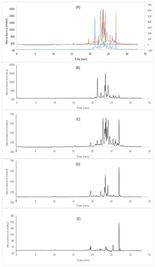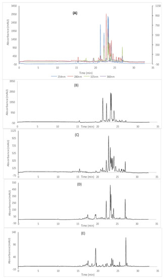 cLC−DAD chromatogram of acetonic extracts; (A) combined chromatograms, (B) 254 nm, (C) 280 nm (D) 325 nm (E) 360 nm.