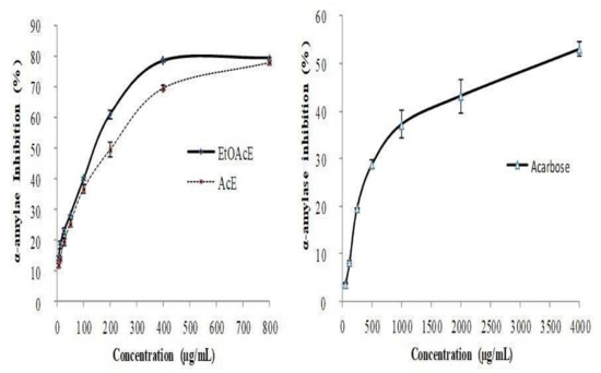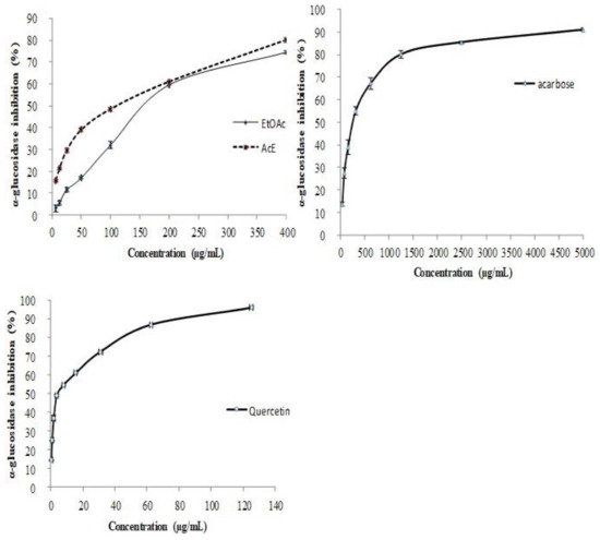 The α-glucosidase inhibitory capacity of EtOAcE and AcE of R. tuberculata was determined according to the developed method [37], where acarbose (78.125–5000 µg/mL) and quercetin (0.48–125 µg/mL) were used as a positive control. A volume of 20 µL of each extract (15.625–1000 µg/mL) or acarbose solution at different concentrations was mixed with 100 µL of α-glucosidase solution (0.1 U) prepared in phosphate buffer (100 mM, pH 6.9) and 80 µL PNPG (5 mM) in 96-well microplate and incubated for 30 min at 37 °C. Similarly, a blank was prepared by the addition of sample solution to all reaction reagents without enzyme solution. The reaction was stopped by the addition of the sodium carbonate solution (0.2 M). The absorbance was then read at 405 nm in initial time (0) and after 30 min.