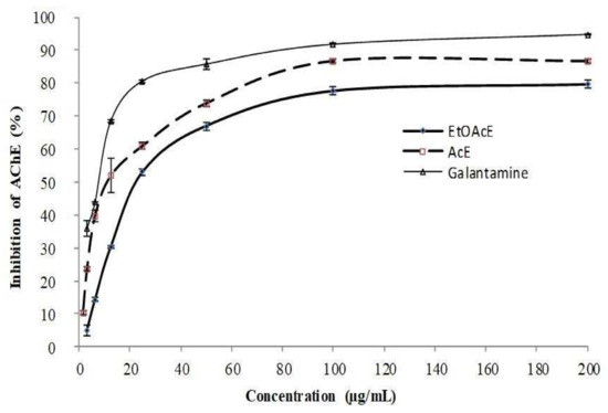 The neuroprotective effect of the target extracts was performed by determining Acetylcholinesterase (AChE) inhibition capacity as previously described in the literature [38], using Galantamine as a positive control. Briefly, a volume of 20 µL of AChE enzyme solution (5.32 × 10−3 U) was added to a mixture containing 150 µL of sodium phosphate buffer (0.1 M, pH 8.02) and 10 µL of each extract or standard at different concentrations (3.25–200 µg/mL). After an incubation period of 15 min at 37 °C, a volume of 10 µL of the revealing solution of DTNB (5.50-Dithio-bis (2-nitrobenzoic) acid (0.5 mM)) and 10 µL of the substrate of the reaction (acetylthiocholine iodide ACI (0.73 mM)) were added. A blank was prepared by adding the sample solution to all reaction reagents without enzyme solution. The hydrolysis reaction of the acetylthiocholine iodide by acetylcholinesterase was monitored at 412 nm.