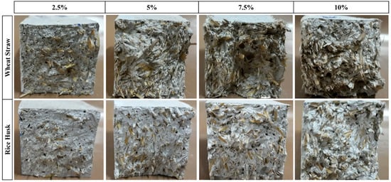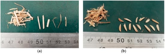 The rice husk used for this study was collected from a local rice processing plant where it is produced during the rice milling process. Results of chemical analysis and density of rice husk used are shown in Table 1. It was lighter in weight compared to wheat straw and more than 10 times lighter than gypsum. It was mainly comprised of particles with a maximum length dimension of 9 mm and a width of 2.40 mm, as shown in Figure 1b. A visual analysis of both the agricultural residues showed that the surface of the rice husk was rough while wheat straw particles had a smooth surface. Also, the rice husk particles were stiffer compared to the wheat straw. The same roughness was proven by the microstructure analysis of both wheat straw and rice husk by Wang et al. [] and Chen et al. [], respectively.