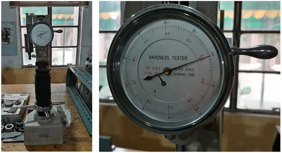 Different types of test specimens were prepared for each mix and their details are mentioned in Table 3. The density of the developed composites was determined using the prism samples of dimensions 160 mm × 40 mm × 40 mm made for flexural strength and hardness tests. After one day of casting, the specimens were unmolded and cured at room temperature for seven days. The samples were then placed in an oven at 40 °C for 24 h and taken out for cooling and the weights were recorded. This weight was used to determine the density of the composites by dividing it by the volume of the prism specimen. The shore C hardness was determined using the prism specimen (160 mm × 40 mm × 40 mm) in accordance with EN 102042 [] using the test setup as shown in Figure 2. A total of 30 measurements were taken on three prepared specimens for each gypsum mix (10 readings for each specimen). The average of 30 values was taken as shore C hardness for each type of gypsum mixture.