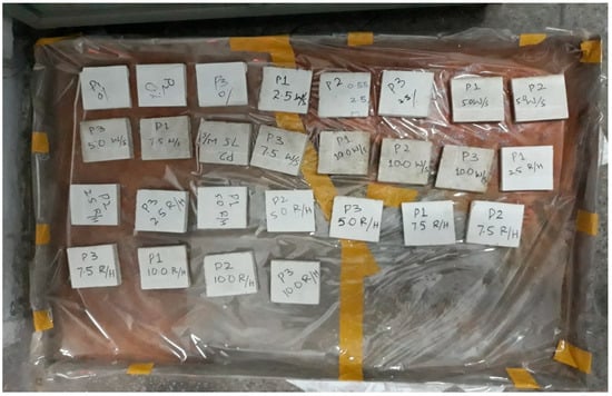 Following the same procedure as used by Sumin Kim [], the water absorption test was performed on samples with dimensions 100 mm × 100 mm × 15 mm. Three specimens of each residue proportion were prepared to determine the water absorption for the respective gypsum mix. First, the weights in the dry state were measured before immersing the samples in water. Then, the specimens were placed under 3 cm water for 24 h at 20 ± 1 °C as shown in Figure 3. After 24 h, the samples were taken out of the water and wiped with a towel to remove water from surfaces. For the 24 h immersion, no thickness swelling was observed in any gypsum composite. Finally, the increase in weight of each specimen was determined as the difference between the final and initial weight of the specimen and it was used for calculating water absorption. In addition, the thickness of the specimen at its center point was measured before and after the immersion to detect any thickness swelling over the 24 h immersion period.