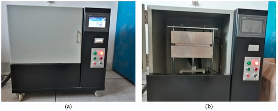 For the thermal conductivity test, gypsum plates measuring 300 mm × 300 mm × 15 mm were prepared for each mix. These plates were tested according to EN 12667:2001 [] in guarded hot plate apparatus as shown in Figure 4, having a range of 0.015–2 W/m·K to determine the thermal conductivity coefficient. The thermal conductivity coefficient was calculated as follows: